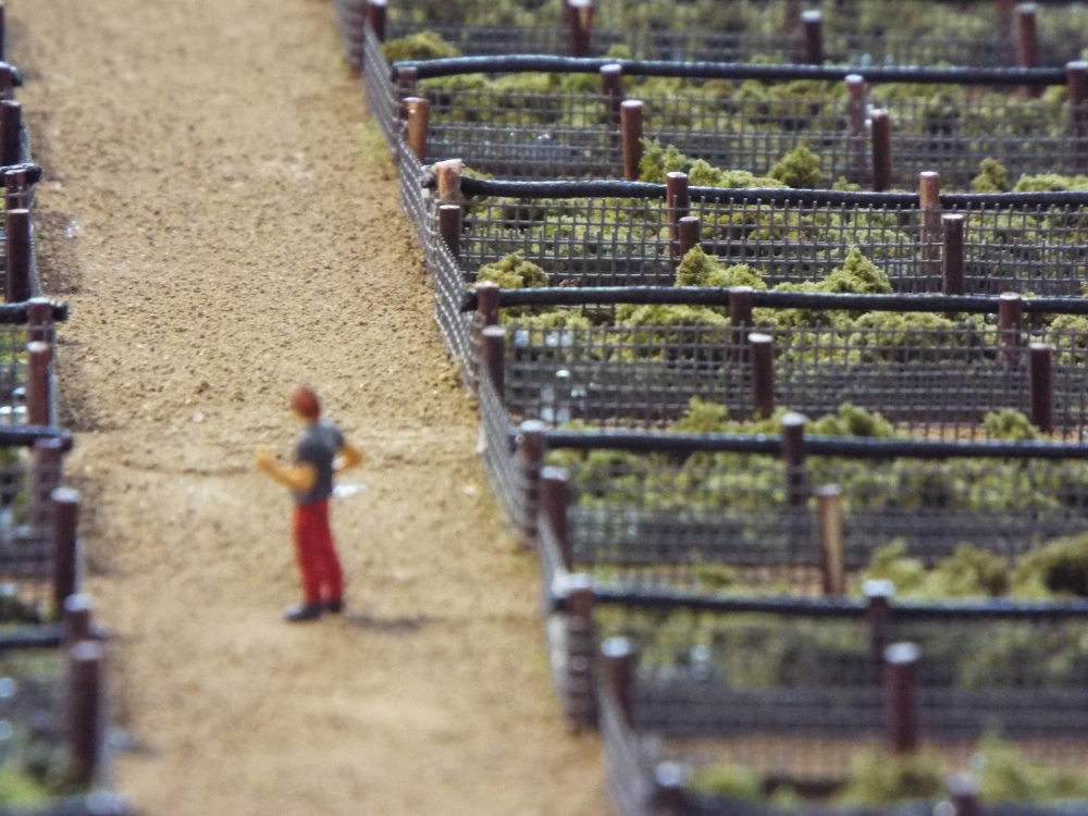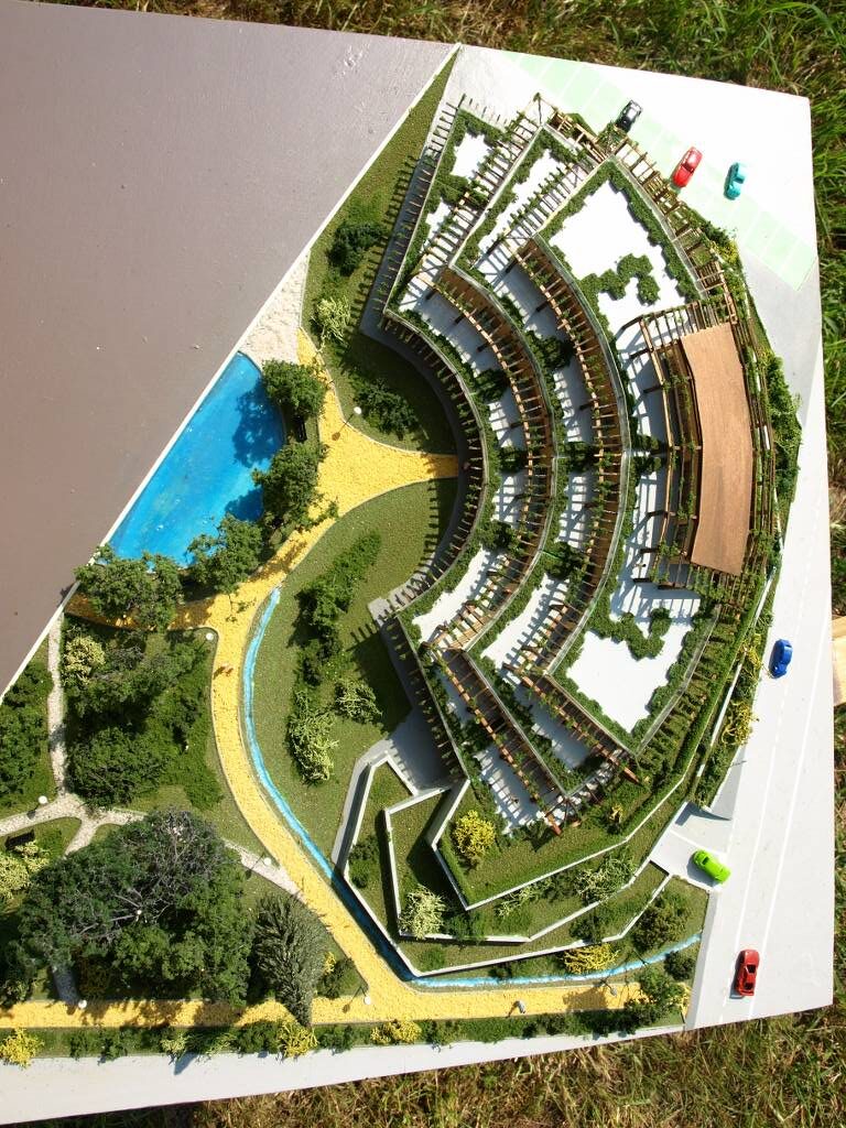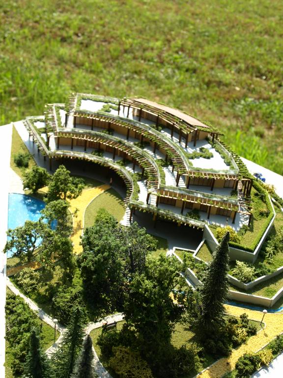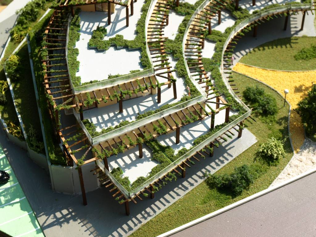 Plastico di sistemazione e recupero di un’area pubblica, anch’esso realizzato con curve di livello prima della posa del terreno definitivo. Plastico in scala 1:100 con tramezzatura interna. Già visibile l’edera che corre
